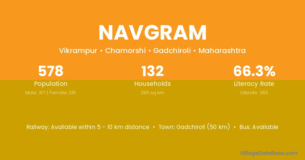 Gadchiroli (50 km) is the nearest town to Navgram village for major economic activities and is located approximately 50 km away.