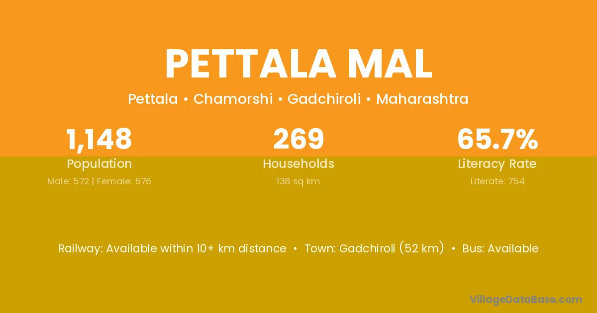Gadchiroli (52 km) is the nearest town to Pettala Mal village for major economic activities and is located approximately 52 km away.