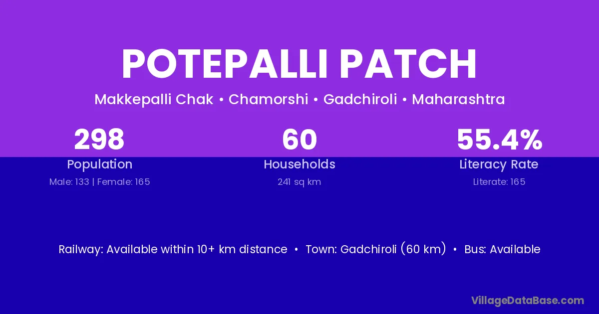 Gadchiroli (60 km) is the nearest town to Potepalli Patch village for major economic activities and is located approximately 60 km away.