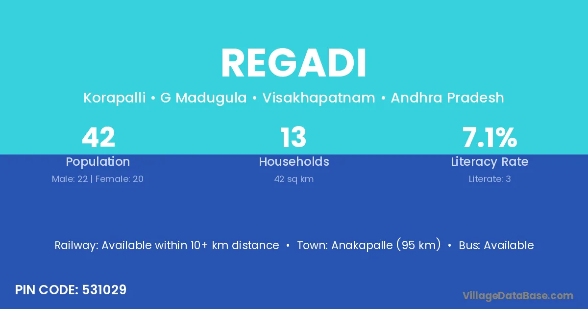 The literacy rate of Regadi village is 67.86%. Male literacy stands at 74.29% and female literacy at 60.67%.