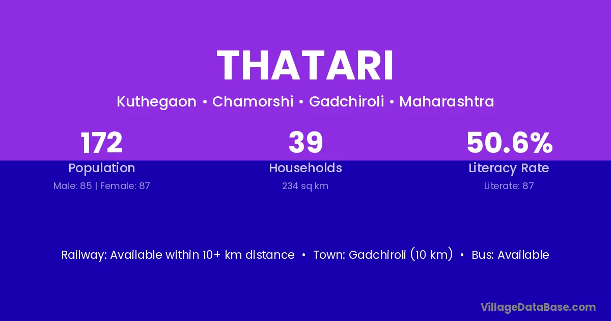 Gadchiroli (10 km) is the nearest town to Thatari village for major economic activities and is located approximately 10 km away.