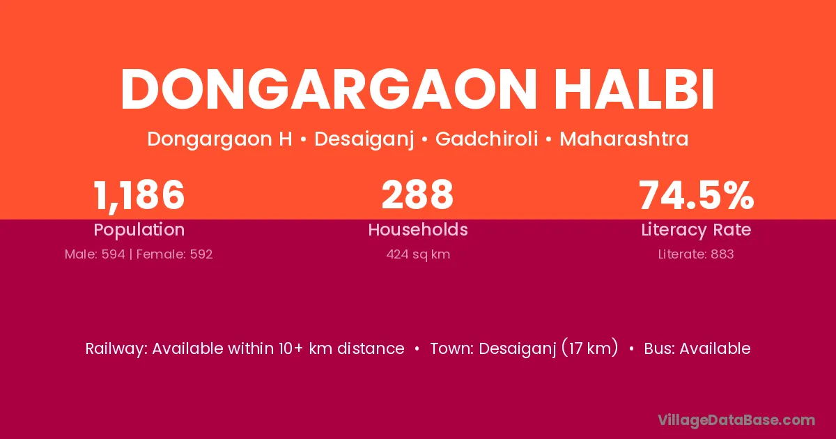 Dongargaon Halbi village has a total population of 1,186 people, of which 594 are males and 592 are females.