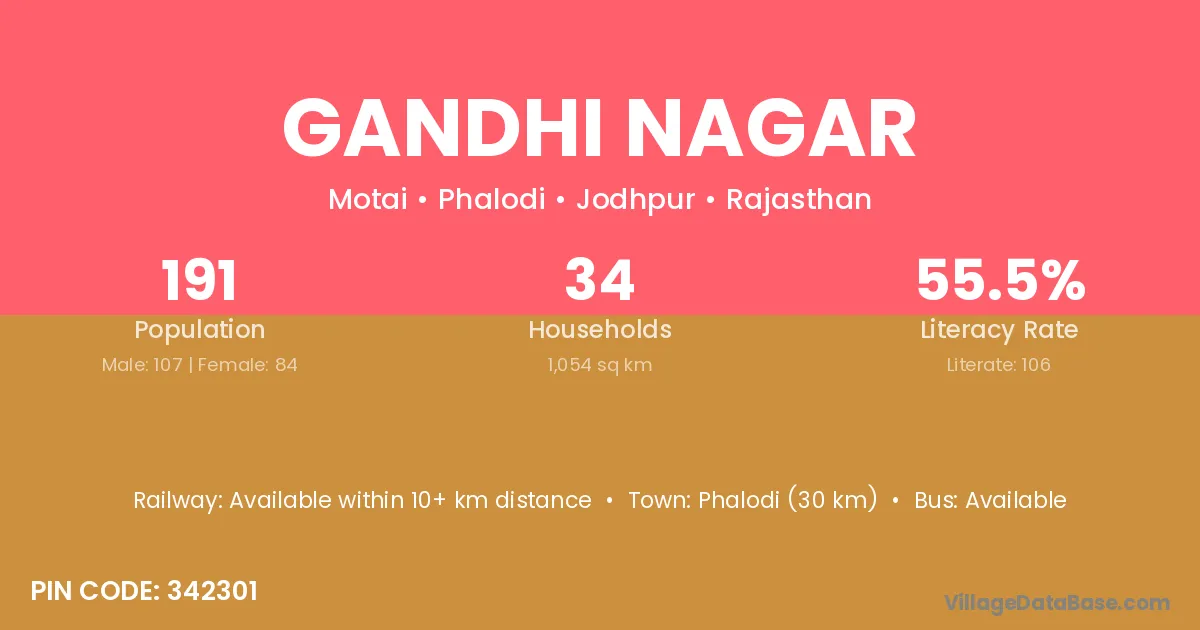 The literacy rate of Gandhi Nagar village is 69.71%. Male literacy stands at 78.24% and female literacy at 61.13%.