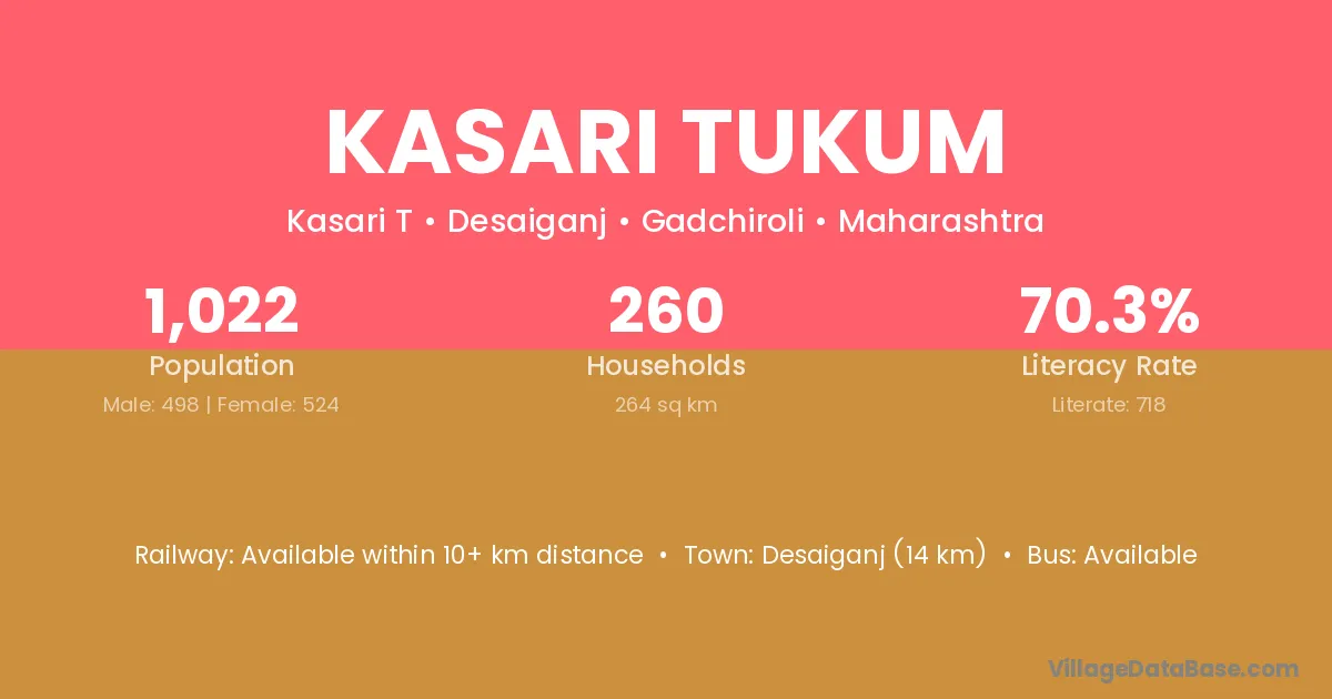 Desaiganj (14 km) is the nearest town to Kasari Tukum village for major economic activities and is located approximately 14 km away.