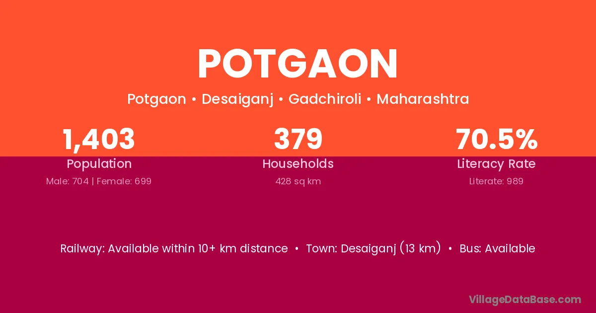 Potgaon village has a total population of 1,403 people, of which 704 are males and 699 are females.