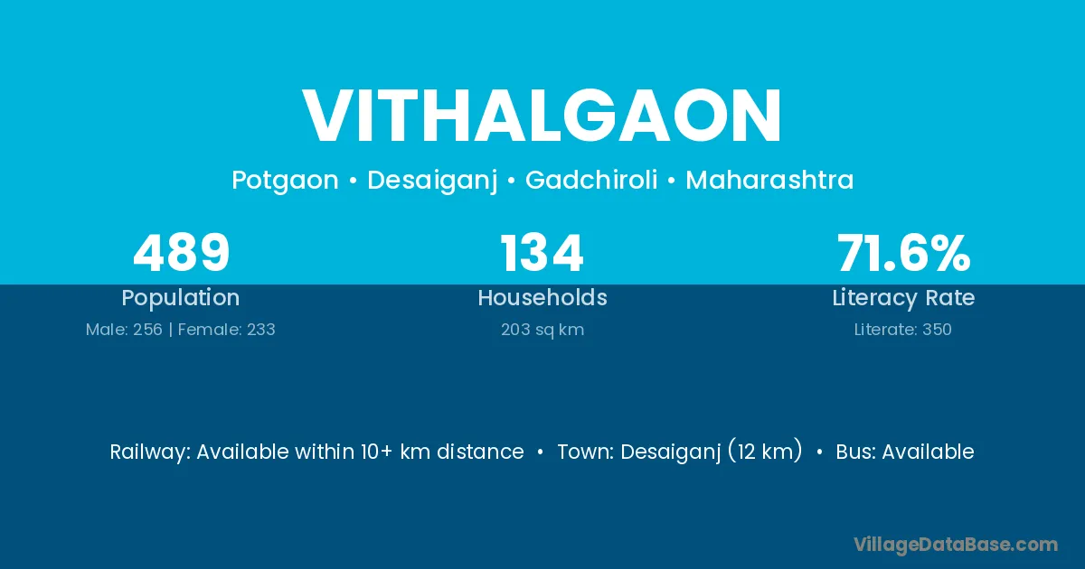 Desaiganj (12 km) is the nearest town to Vithalgaon village for major economic activities and is located approximately 12 km away.