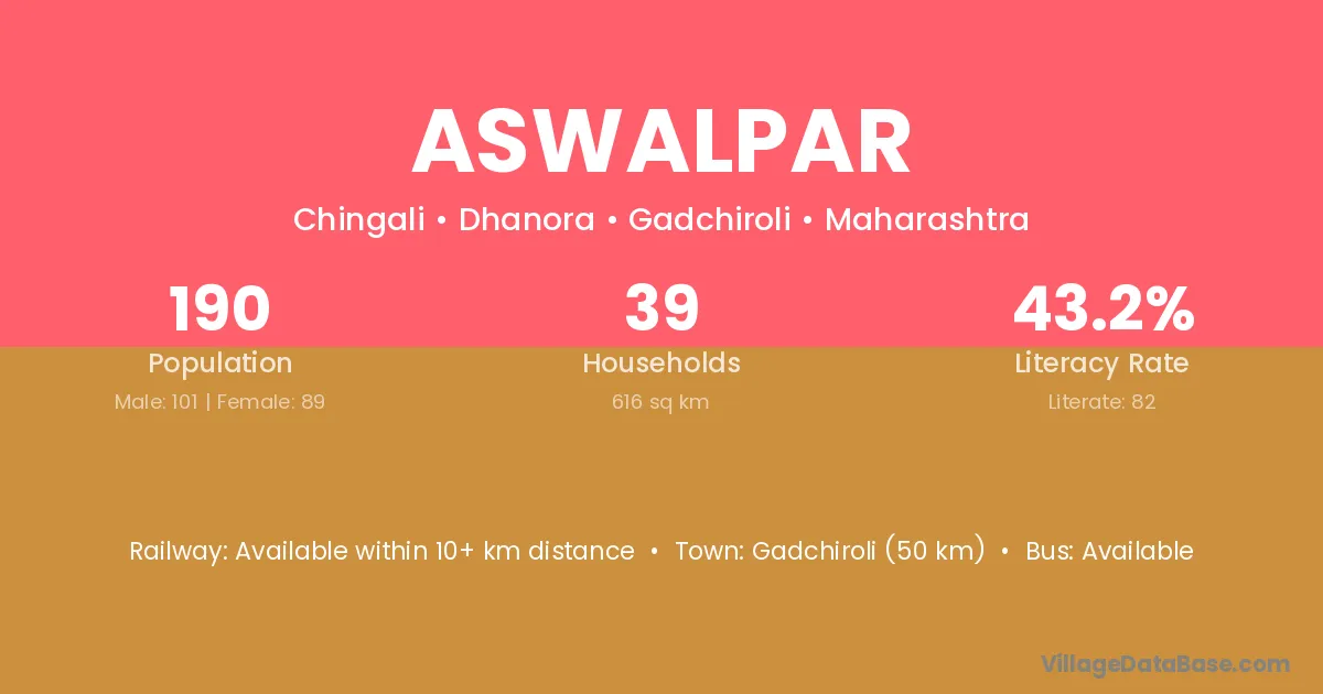 Gadchiroli (50 km) is the nearest town to Aswalpar village for major economic activities and is located approximately 50 km away.