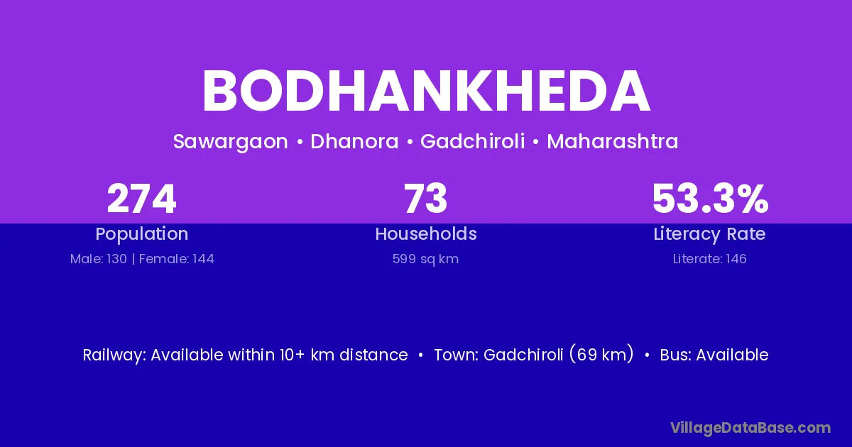 Gadchiroli (69 km) is the nearest town to Bodhankheda village for major economic activities and is located approximately 69 km away.