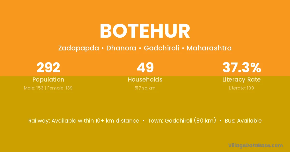 Gadchiroli (80 km) is the nearest town to Botehur village for major economic activities and is located approximately 80 km away.