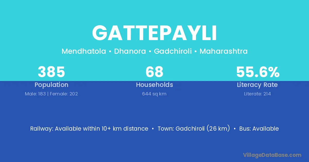 Gadchiroli (26 km) is the nearest town to Gattepayli village for major economic activities and is located approximately 26 km away.