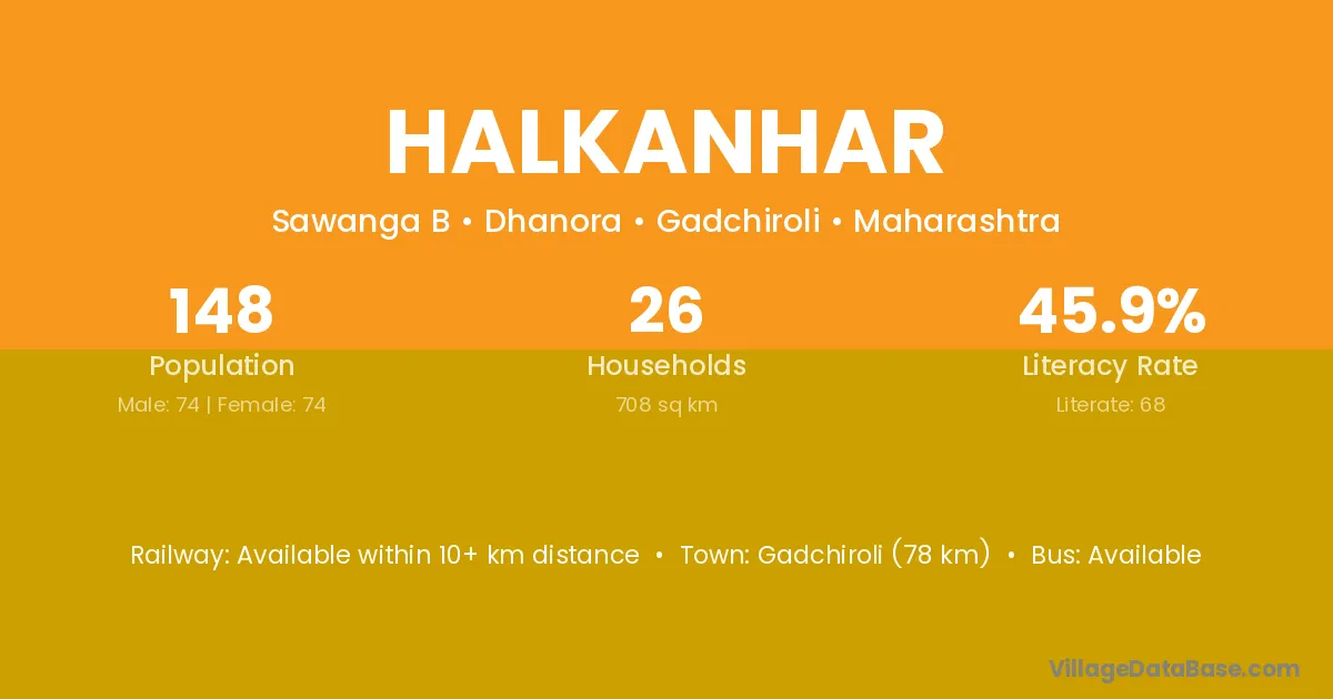 Gadchiroli (78 km) is the nearest town to Halkanhar village for major economic activities and is located approximately 78 km away.