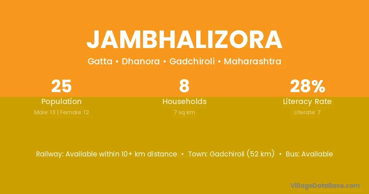 Gadchiroli (52 km) is the nearest town to Jambhalizora village for major economic activities and is located approximately 52 km away.
