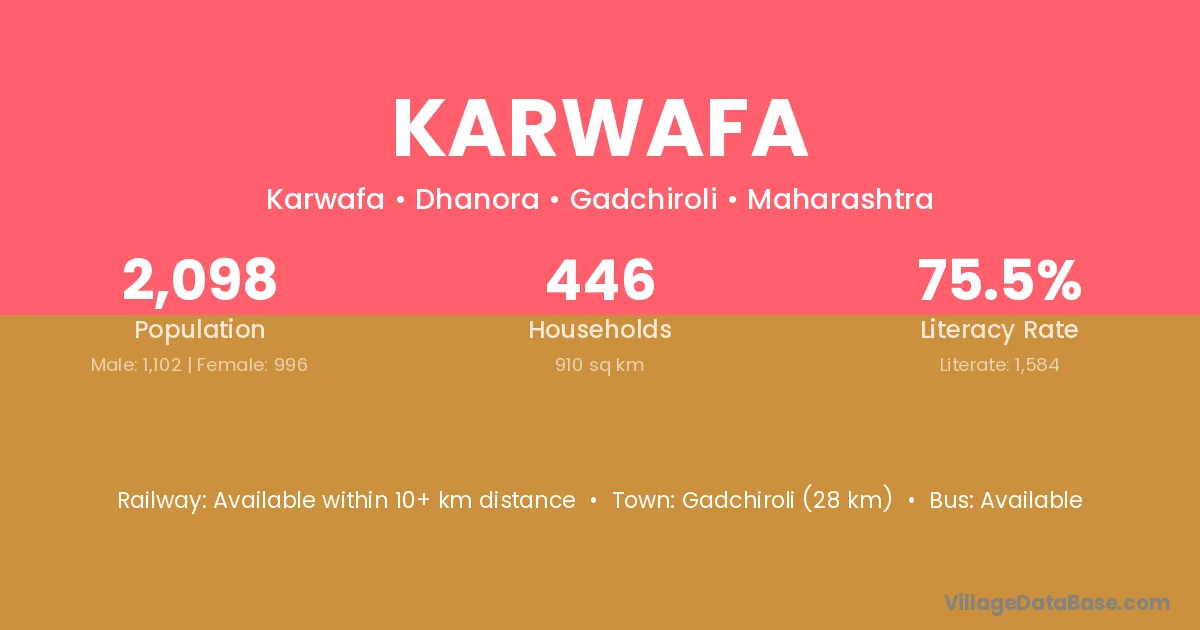 Gadchiroli (28 km) is the nearest town to Karwafa village for major economic activities and is located approximately 28 km away.