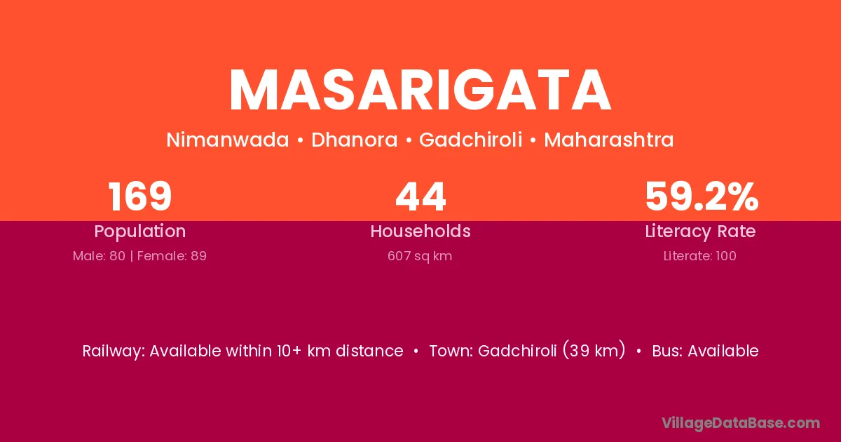 Gadchiroli (39 km) is the nearest town to Masarigata village for major economic activities and is located approximately 39 km away.
