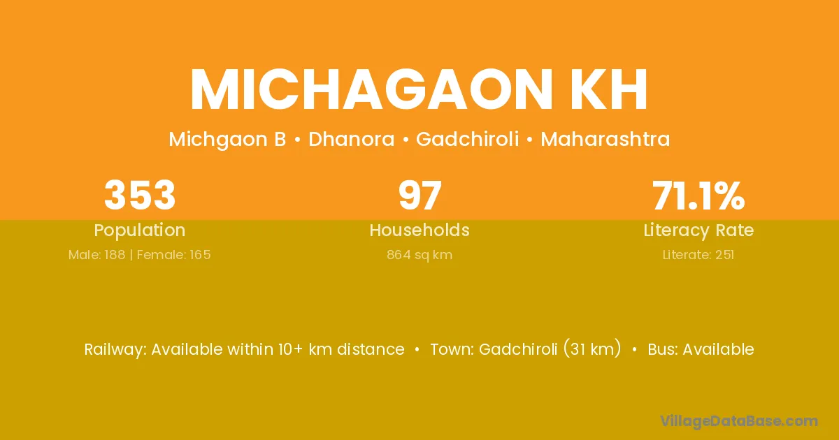 Gadchiroli (31 km) is the nearest town to Michagaon Kh village for major economic activities and is located approximately 31 km away.