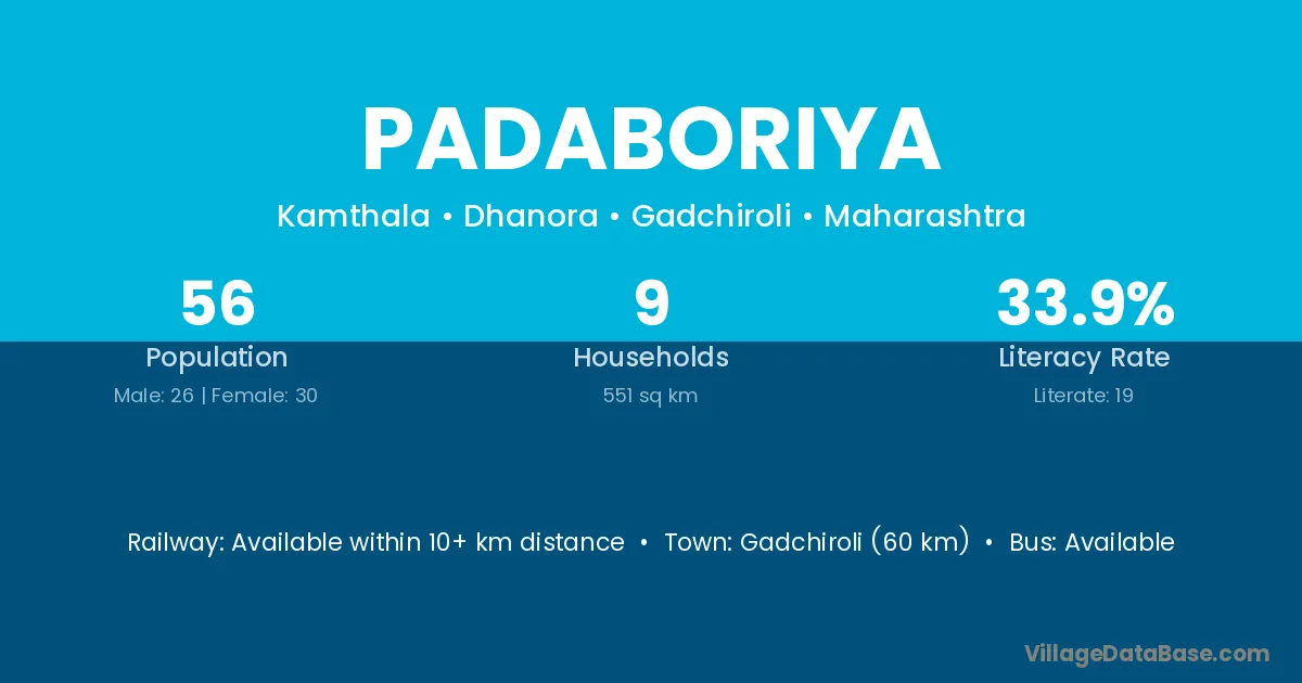 Gadchiroli (60 km) is the nearest town to Padaboriya village for major economic activities and is located approximately 60 km away.