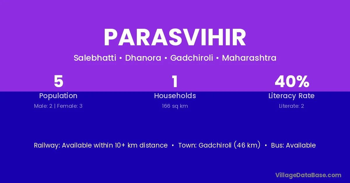 Gadchiroli (46 km) is the nearest town to Parasvihir village for major economic activities and is located approximately 46 km away.