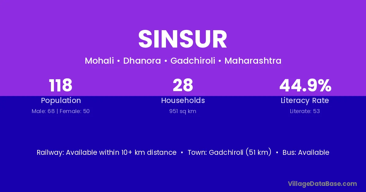 Gadchiroli (51 km) is the nearest town to Sinsur village for major economic activities and is located approximately 51 km away.