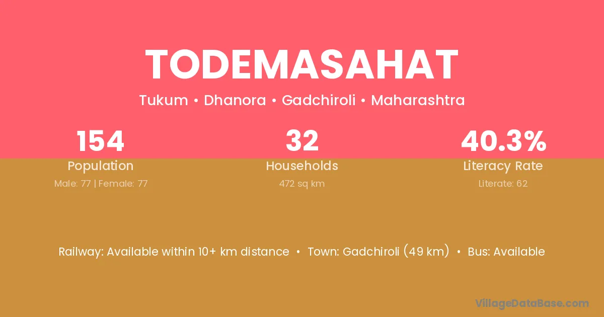 Gadchiroli (49 km) is the nearest town to Todemasahat village for major economic activities and is located approximately 49 km away.