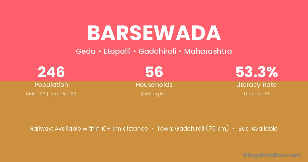 Gadchiroli (76 km) is the nearest town to Barsewada village for major economic activities and is located approximately 76 km away.