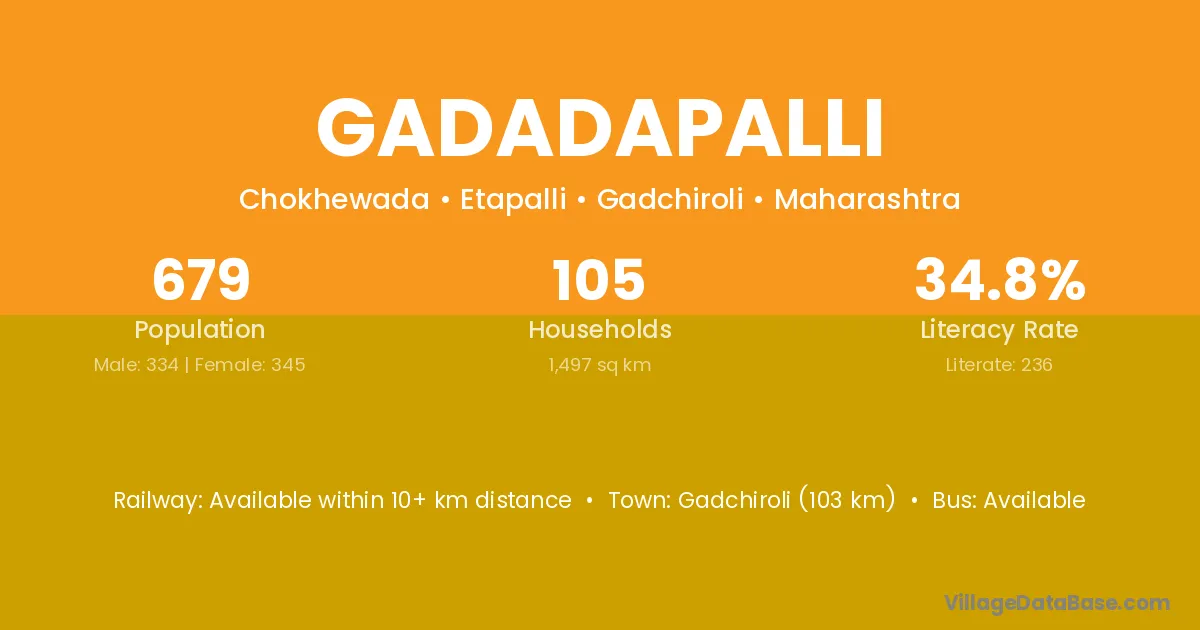 Gadchiroli (103 km) is the nearest town to Gadadapalli village for major economic activities and is located approximately 103 km away.