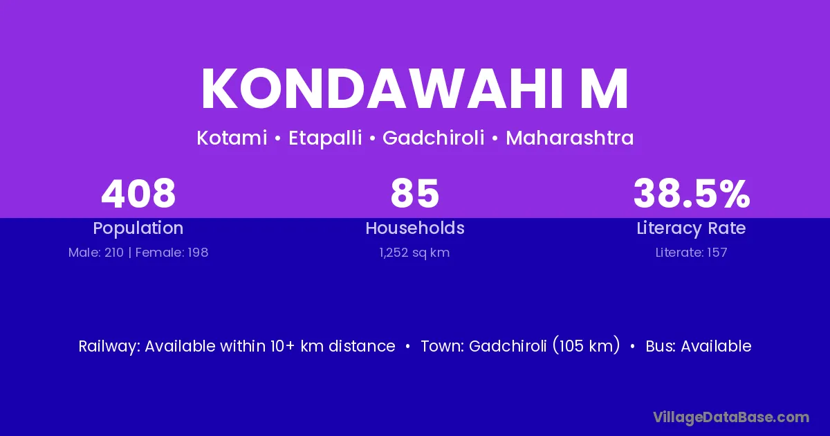 Kondawahi M village has a total population of 408 people, of which 210 are males and 198 are females.