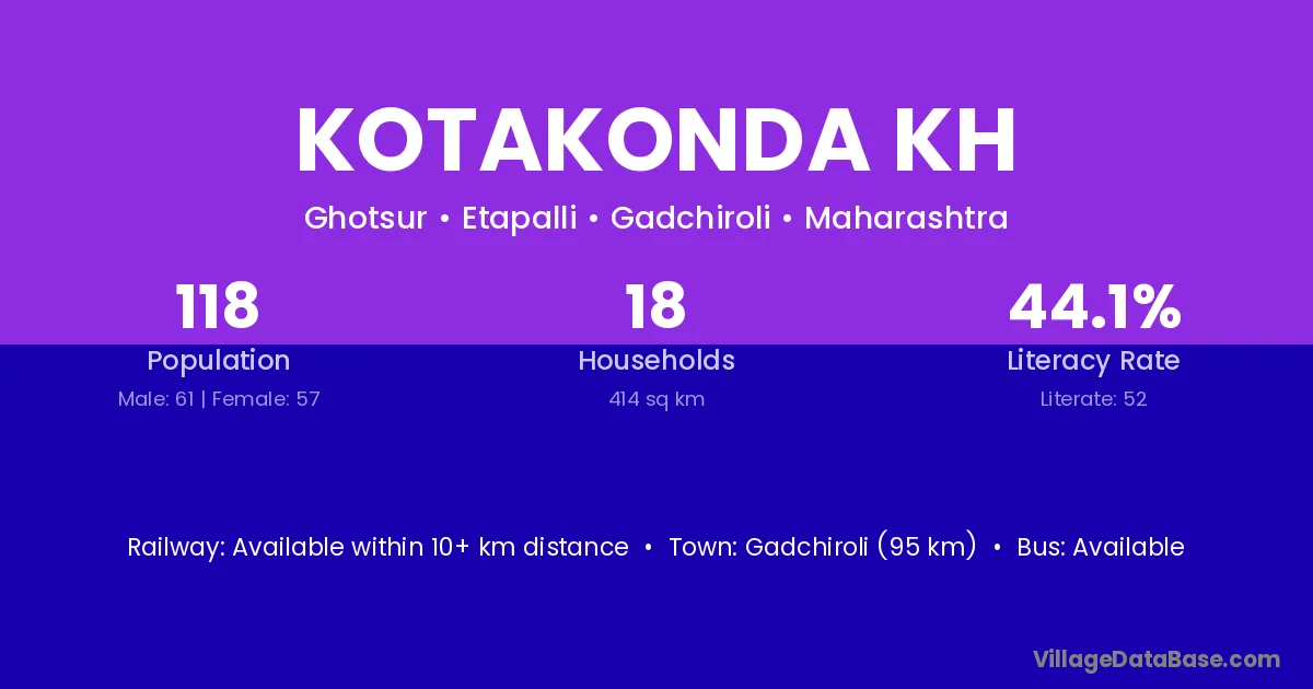 Gadchiroli (95 km) is the nearest town to Kotakonda Kh village for major economic activities and is located approximately 95 km away.