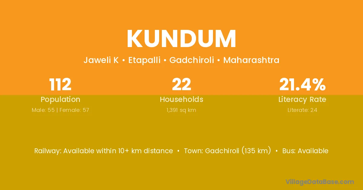Gadchiroli (135 km) is the nearest town to Kundum village for major economic activities and is located approximately 135 km away.