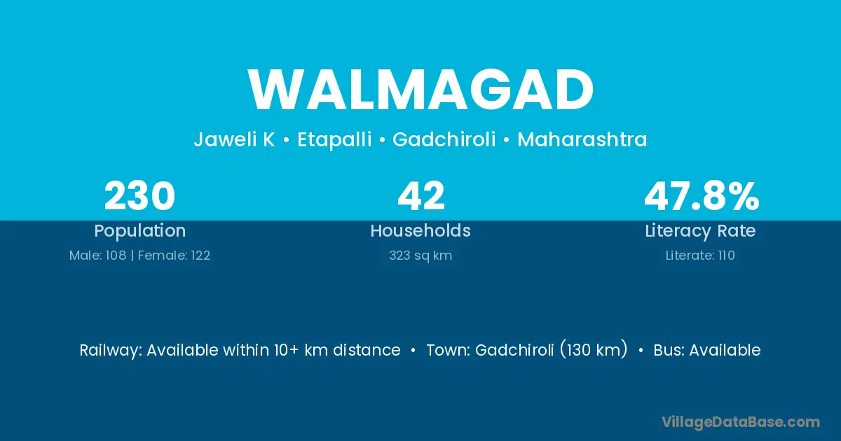Gadchiroli (130 km) is the nearest town to Walmagad village for major economic activities and is located approximately 130 km away.