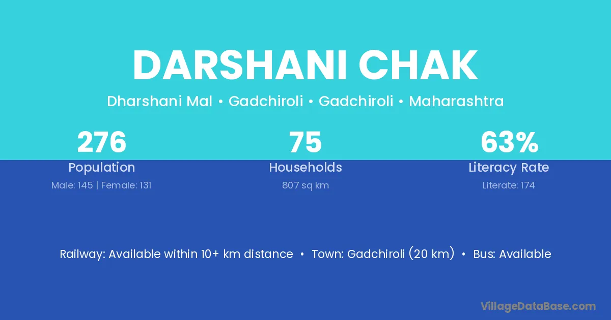 Gadchiroli (20 km) is the nearest town to Darshani Chak village for major economic activities and is located approximately 20 km away.