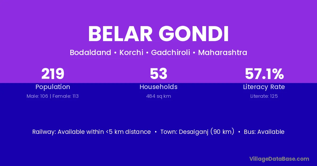 Desaiganj (90 km) is the nearest town to Belar Gondi village for major economic activities and is located approximately 90 km away.