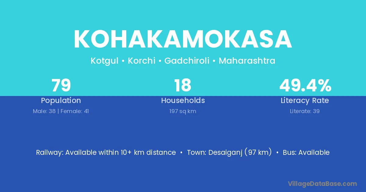 Kohakamokasa village has a total population of 79 people, of which 38 are males and 41 are females.