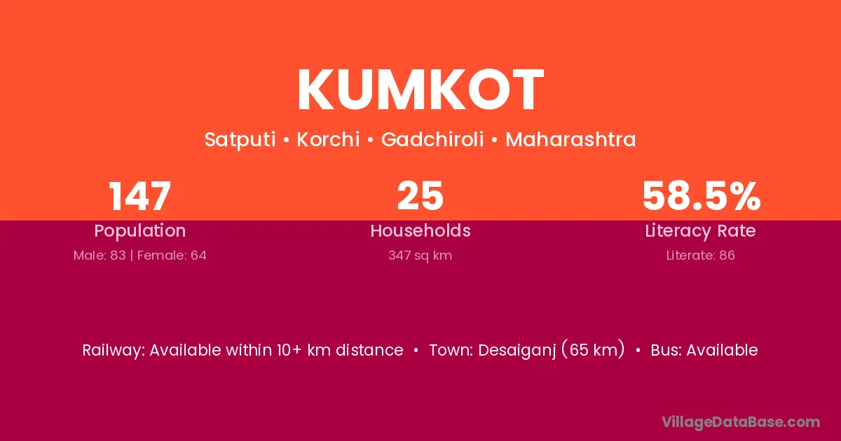 Desaiganj (65 km) is the nearest town to Kumkot village for major economic activities and is located approximately 65 km away.