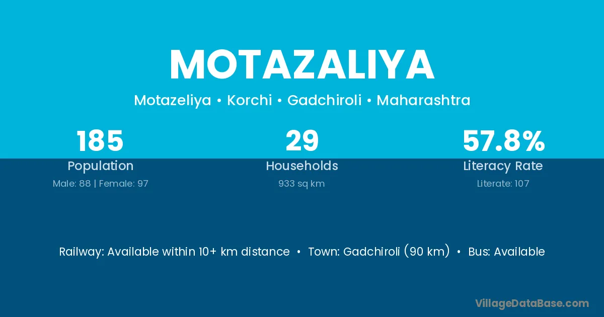 Gadchiroli (90 km) is the nearest town to Motazaliya village for major economic activities and is located approximately 90 km away.