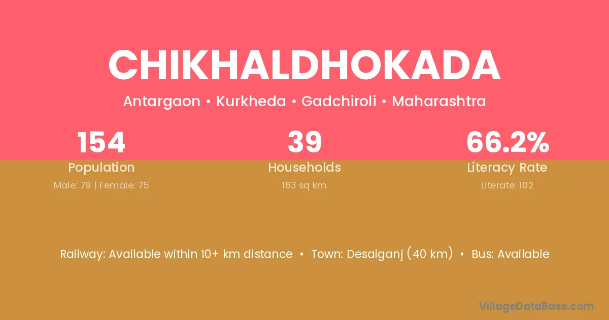 Chikhaldhokada village has a total population of 154 people, of which 79 are males and 75 are females.