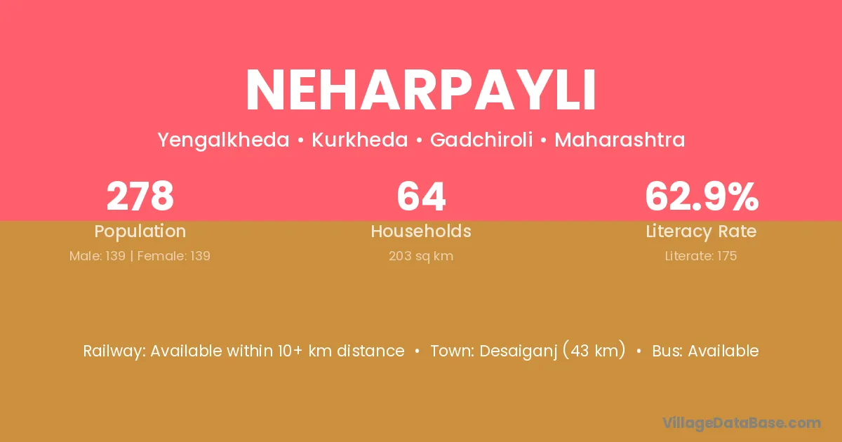 Desaiganj (43 km) is the nearest town to Neharpayli village for major economic activities and is located approximately 43 km away.