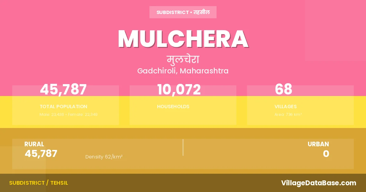According to the 2011 census The total area of Mulchera Tehsil is 736 km², with a population of 45787 people. The population density is 62 inhabitants per square kilometre, and there are approximately 10072 houses in the sub district.