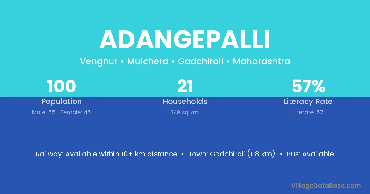 Gadchiroli (118 km) is the nearest town to Adangepalli village for major economic activities and is located approximately 118 km away.