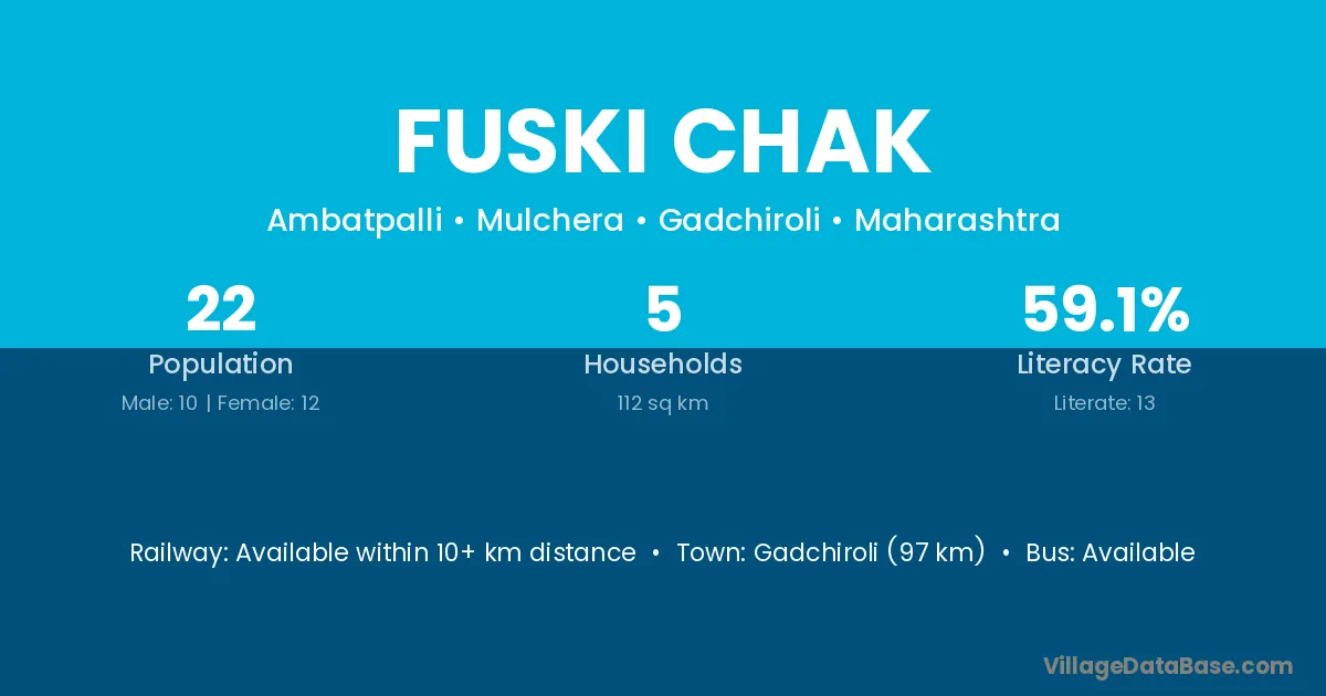 Gadchiroli (97 km) is the nearest town to Fuski Chak village for major economic activities and is located approximately 97 km away.