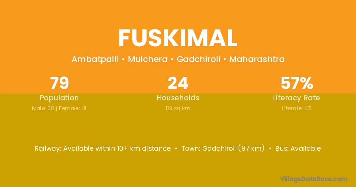 Gadchiroli (97 km) is the nearest town to Fuskimal village for major economic activities and is located approximately 97 km away.