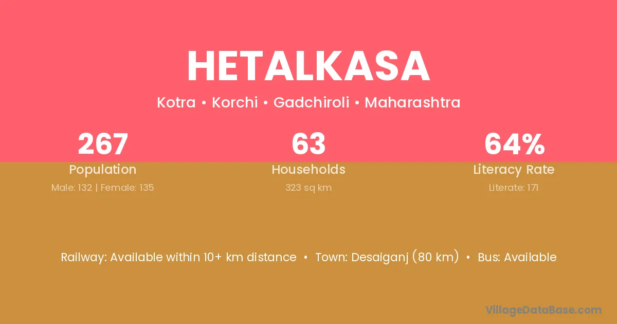 Gadchiroli (80 km) is the nearest town to Hetalkasa village for major economic activities and is located approximately 80 km away.