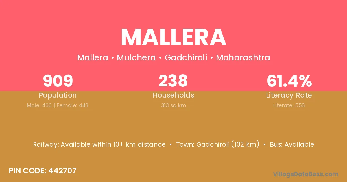 Gadchiroli (102 km) is the nearest town to Mallera village for major economic activities and is located approximately 102 km away.