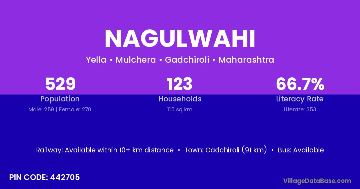 Gadchiroli (91 km) is the nearest town to Nagulwahi village for major economic activities and is located approximately 91 km away.