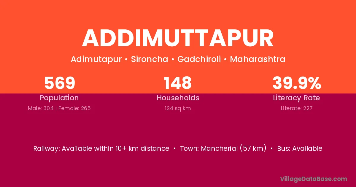 Mancherial (57 km) is the nearest town to Addimuttapur village for major economic activities and is located approximately 57 km away.