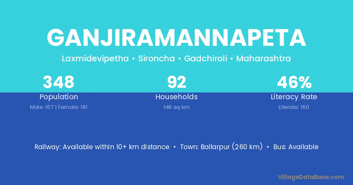 Ballarpur (260 km) is the nearest town to Ganjiramannapeta village for major economic activities and is located approximately 260 km away.