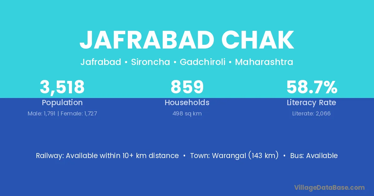 Warangal (143 km) is the nearest town to Jafrabad Chak village for major economic activities and is located approximately 143 km away.