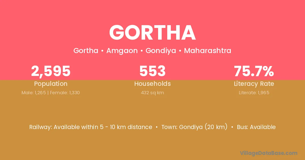 Gondiya (20 km) is the nearest town to Gortha village for major economic activities and is located approximately 20 km away.