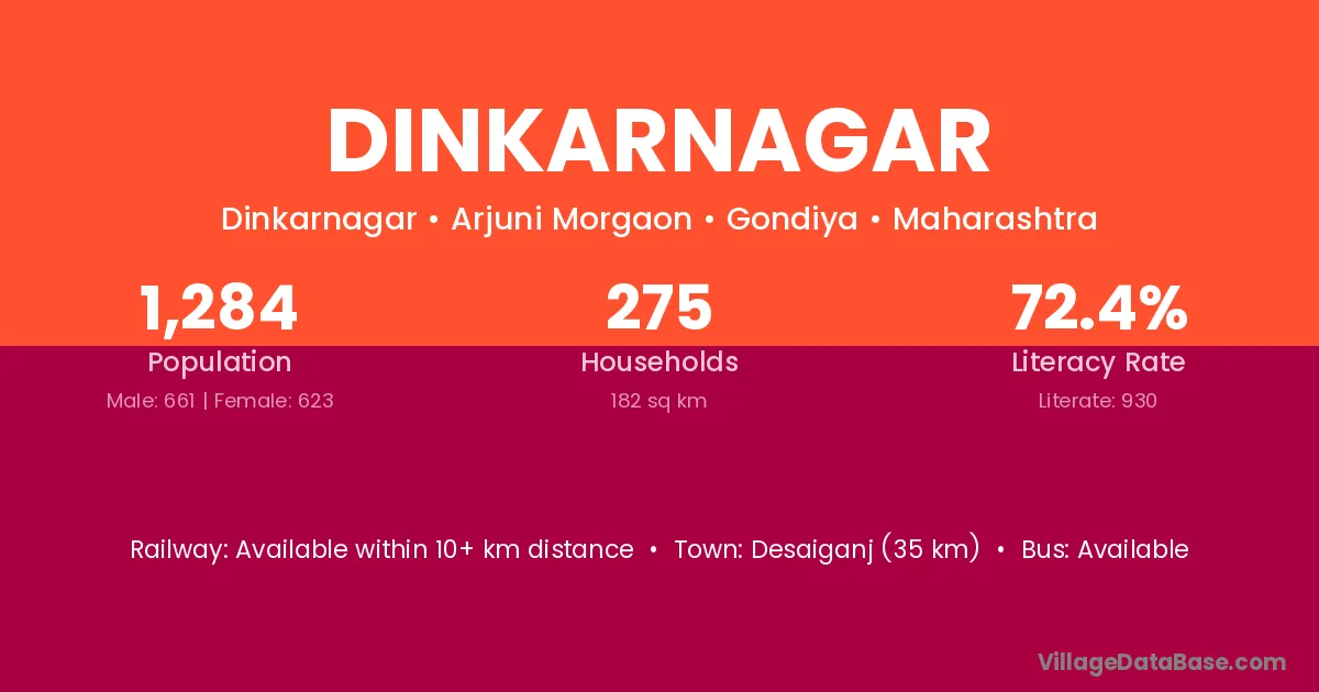 Dinkarnagar village has a total population of 1,284 people, of which 661 are males and 623 are females.