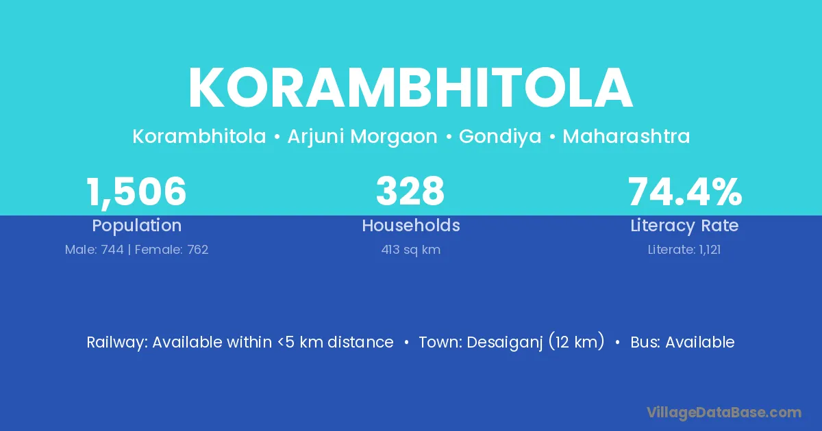 Korambhitola village has a total population of 1,506 people, of which 744 are males and 762 are females.