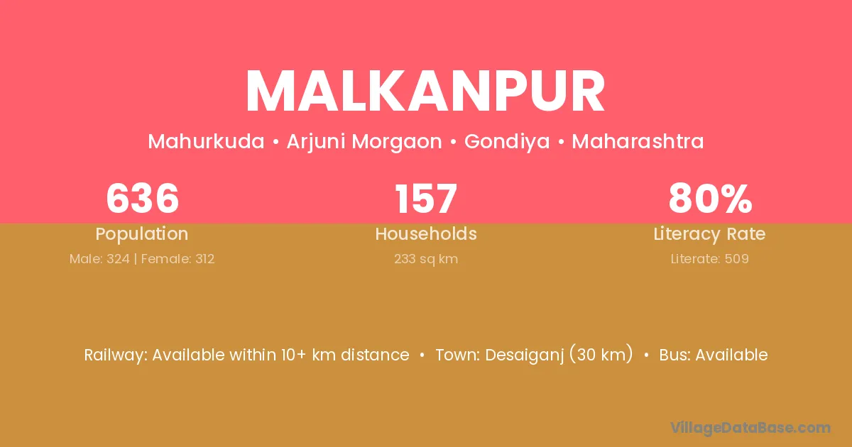 Desaiganj (30 km) is the nearest town to Malkanpur village for major economic activities and is located approximately 30 km away.